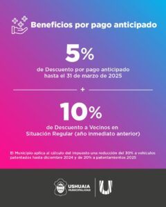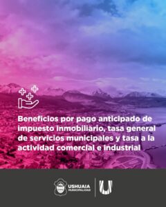 La Municipalidad de Ushuaia informa a vecinos y vecinas que, hasta el 31 de marzo, continúan los beneficios del descuento del 5 y 10 por ciento, para el pago anual anticipado, aplicable al pago de impuesto inmobiliario, tasa general de servicios municipales, impuesto automotor y tasa a la actividad comercial e industrial.
