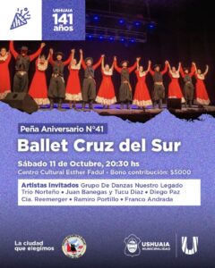 La Secretaría de Cultura y Educación de la Municipalidad de Ushuaia acompañará este sábado 11 de octubre a las 20:30 horas en el Centro Cultural Esther Fadul la “Gran Peña Aniversario 41° Ballet Cruz del Sur”.