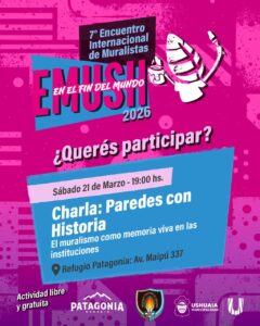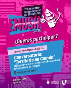el domingo 15 hasta el martes 31 de marzo. La misma contará con visitas guiadas sin inscripción previa y horarios de 10:00 a 16:00 horas y reúne obras del Programa Municipal de Muralismo y de ediciones del EMUSH, celebrando el proceso colectivo de la ciudad y su declaración como Ciudad de Murales. Continuando, el día jueves 19 a las 19:00 horas en la Antigua Casa Beban con el Conversatorio “Territorio en Común: diálogos sobre arte, territorio y el crecimiento del muralismo en Ushuaia”, donde habrá un espacio de intercambio entre artistas de la ciudad y las y los invitados al EMUSH 2026 compartiendo experiencias, procesos de obras y miradas sobre el muralismo como práctica colectiva. El día viernes 20 de marzo a las 19:00 horas en el Refugio Patagonia, ubicado en Avenida Maipú N° 337, la artista brasileña Ester Diniz brindará la charla “Arte Urbano y Comunidad”, explorando como el arte ejerce de puente entre el territorio, la cultura y la comunidad. Finalizando, el día sábado 21 a las 19:00 horas en el Refugio Patagonia, se llevará adelante junto a la Sociedad Italiana en Ushuaia la charla “Paredes