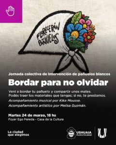 La Municipalidad de Ushuaia a través de la Secretaria de La Mujer y Desarrollo Humano junto a la Dirección de Derechos Humanos y Prevención, invita a los vecinos y vecinas a participar de la jornada colectiva “bordar para no olvidar”, una propuesta de intervención de pañuelos blancos en el marco de las actividades por el Día de la Memoria, la Verdad y la Justicia.