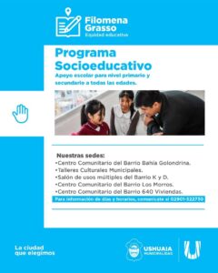 La Secretaría de Políticas Ambientales, Culturales y Educativas de la Municipalidad de Ushuaia informa a la comunidad que continúan abiertas las inscripciones del Programa Socioeducativo “Filomena Grasso”.