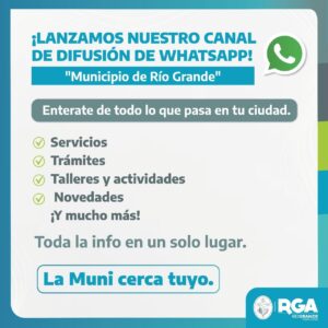 El Municipio de Río Grande recuerda que ya se encuentra disponible el canal oficial de difusión en WhatsApp, una herramienta que permite acceder de manera simple, directa y actualizada a información sobre servicios, trámites, talleres, actividades y novedades de la ciudad.