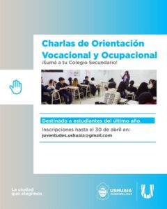 La Secretaría de Políticas Ambientales, Culturales y Educativas de la Municipalidad de Ushuaia informa a la comunidad que se encuentran abiertas las inscripciones a las Charlas de Orientación Vocacional y Ocupacional, destinadas a estudiantes del último año del colegio secundario.