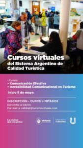 La Secretaría de Turismo de la Municipalidad de Ushuaia informa que, a partir de mayo, se dictarán cursos virtuales enmarcados en el Sistema Argentino de Calidad Turística (SACT), una herramienta impulsada por el Ejecutivo Nacional mediante la Resolución 331/2025.
