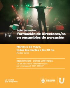 La Secretaría de Políticas Ambientales, Culturales y Educativas de la Municipalidad de Ushuaia impulsará en el Medio Caño un Taller Intensivo de Formación de Directores y Directoras en ensambles de percusión. Quiénes deseen inscribirse, podrán hacerlo vía WhatsApp al 2901-400987.