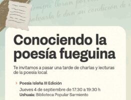 → Lee másCONOCIENDO LA POESÍA FUEGUINA. USHUAIA: POESÍA ISLEÑA III Jueves 4 de septiembre. De 17:30 a 19:30 BIBLIOTECA POPULAR SARMIENTO San Martín 1589 RG: NAVEGAR EN LETRAS III Viernes 12 de septiembre de 18:00 a 20:00 Centro Cultural Yaganes ENTRADAS LIBRES Y GRATUITAS.